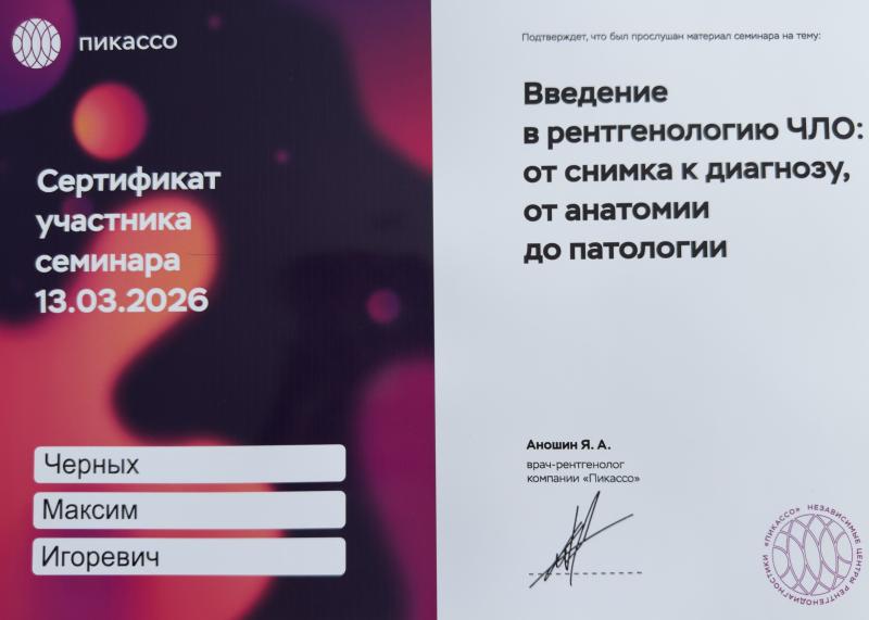 Сертификат N0136310065681 от 19.12.2017г. по специальности «Организация здравоохранения и общественное здоровье» ИДПО ГБОУ ВПО ВГМА им. Н.Н. Бурденко Минздрава России.